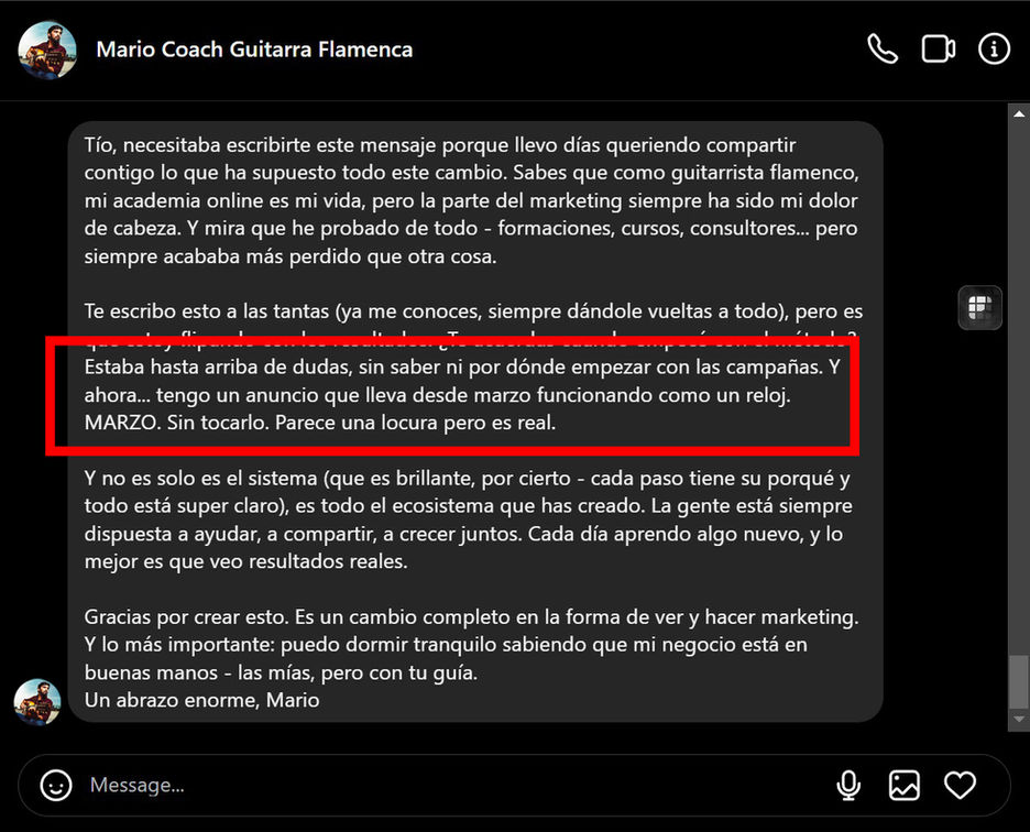 Llevo años con mi academia online de guitarra flamenca, y además gestiono campañas para otros. Había hecho varias formaciones, probado de todo, pero siempre me quedaban muchas dudas. Sabía que había pasos importantes que debía estar saltándome… pero no sabía cuáles ni por qué.
