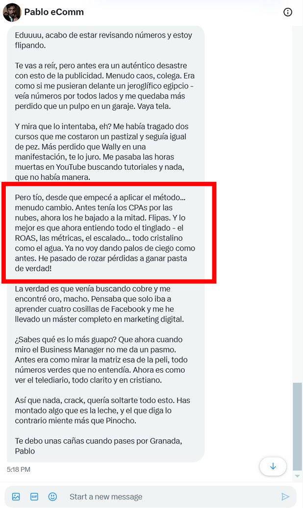 Empecé a ver claro qué significan los datos, cómo interpretar cada métrica, cuándo escalar y cuándo parar. Antes rozaba pérdidas. Ahora lo digo tranquilo: sé que estoy ganando dinero de verdad. Y eso marca la diferencia.